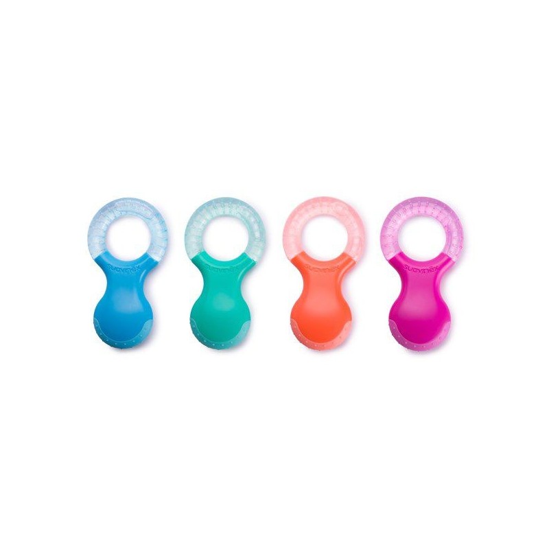 El mordedor refrigerante está indicado para los dientes premolares y bebés a partir de 4 meses, enfriando el agua destilada de su interior alivia las encías inflamadas, además de fortalecer los dientes gracias a sus relieves.