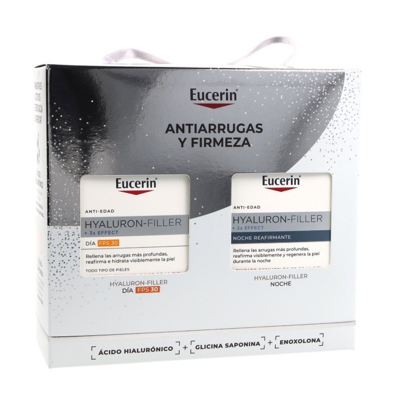 El cofre eucerin hyaluron-filler ofrece una rutina antiedad completa para el cuidado diario del rostro, combinando tratamiento de día y de nocheIncluye la crema hyaluron-filler día fps 30, formulada con ácido hialurónico de alto y bajo peso molecular, que ayuda a rellenar las arrugas desde el interior, hidratar intensamente la piel y protegerla frente a los daños causados por la radiación solarLa rutina se completa con la crema hyaluron-filler noche reafirmante, que actúa durante el descanso nocturno favoreciendo la regeneración de la piel, mejorando su elasticidad y aportando una sensación de piel más firme y suave al despertarIndicado para pieles que buscan combatir los signos del envejecimiento, este cofre ayuda a conseguir un rostro más liso, hidratado y con un aspecto visiblemente rejuvenecido.